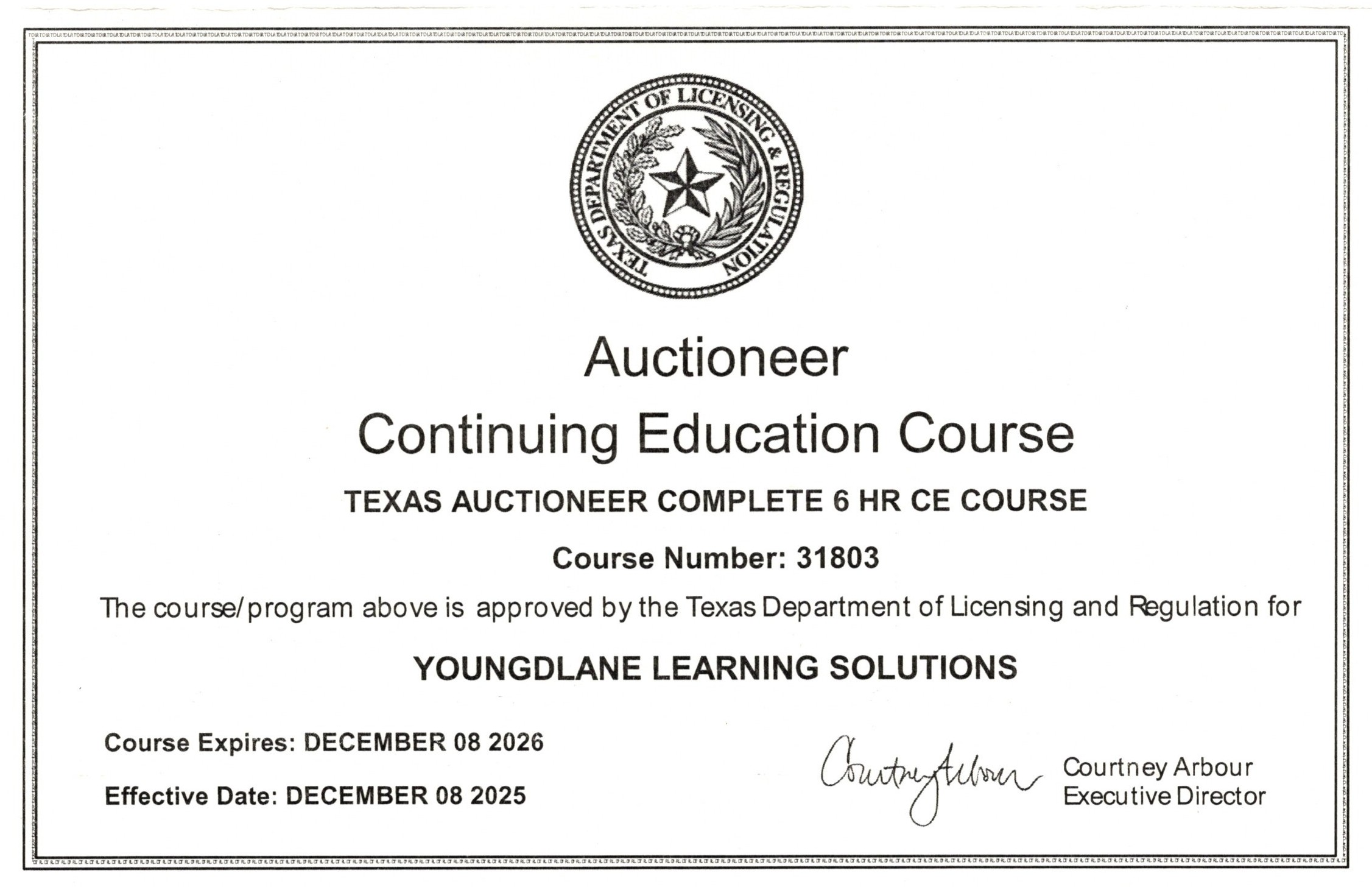 TexasAuctionCE wants to be your course for all of your Texas Auctioneer Continuing Education (CE) in Texas. Our 6 CE course meets TDLR’s requirements for Texas Auctioneers:
